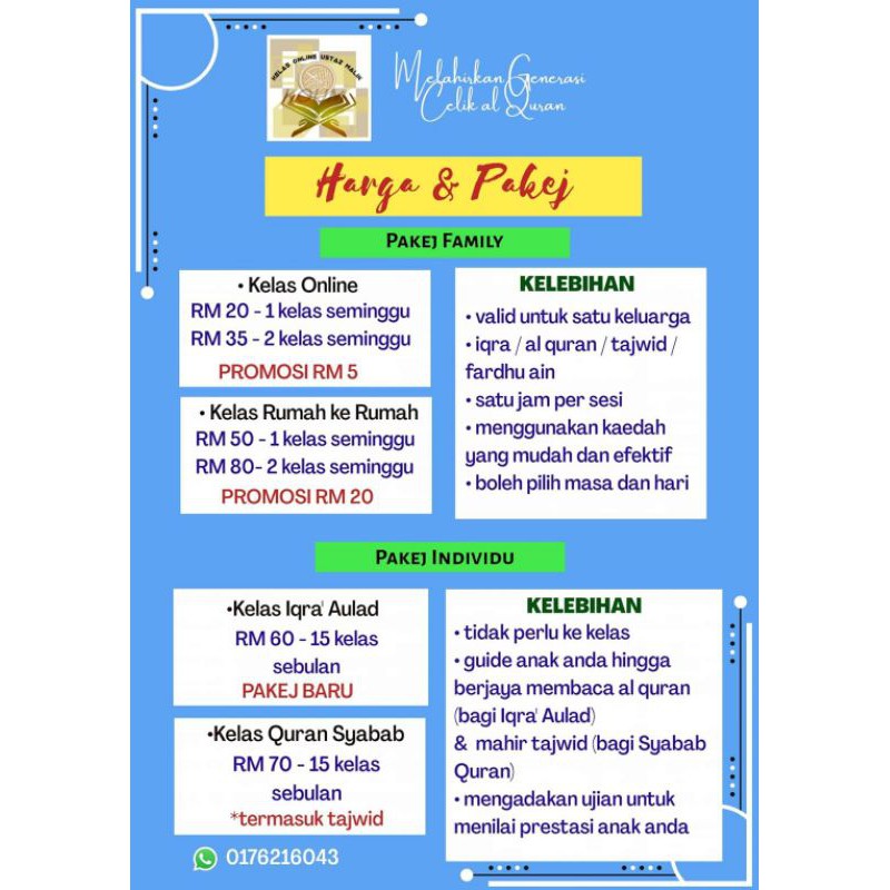 Untuk maklumat lanjut berkenaan belajar mengaji Iqra dan Al-Quran di rumah 2015 boleh hubungi Ustaz Asrul callsmswhatsapp 017-633 60 16. Terima kasih Ngaji Quran Online. Korban Nazar 2021.