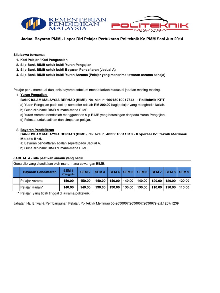 Jadual Bayaran Pelajar Tukar Politeknik Sesi Jun 2014 Pdf