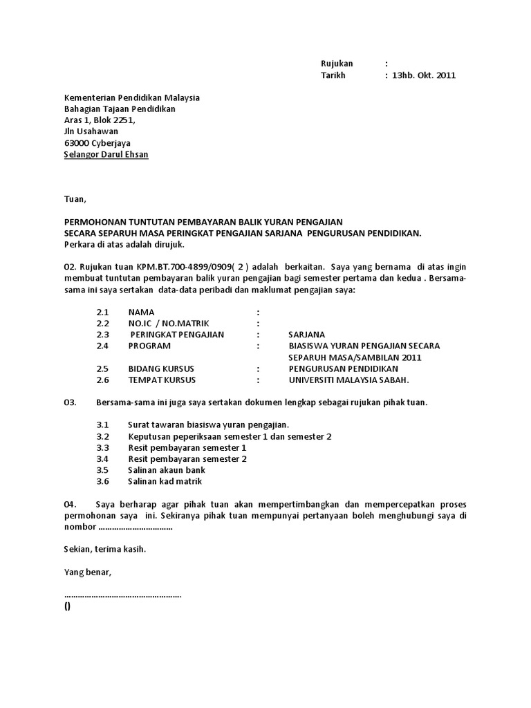 Contoh Surat Tuntutan Yuran Pengajian picture submitted ang submitted by Admin that saved in our collection. Sukan lawatan sambil belajar Kutipan sumbangan one-off. 1 mata pelajaran RM1.