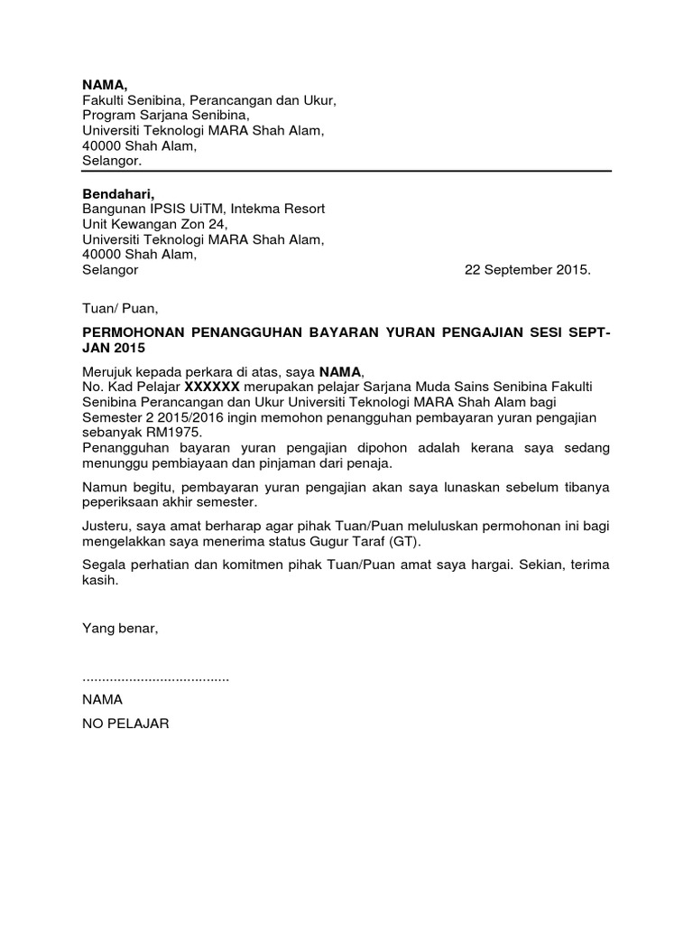Contoh Surat Rayuan Penangguhan Bayaran Yuran Semester. Baik dari segi etika dan juga bukti yang boleh menyusahkan anda pada masa hadapan. Dimaklumkan bil yuran pengajian Sesi I 2021 2022 Sesi 20214 bagi pelajar yang telah dibatalkan bil terdahulu akan mula dijana secara berperingkat mulai minggu kedua November 2021 pada kadar kurang 20 seperti mana yang diumumkan oleh Kementerian Pengajian Tinggi KPT dengan persetujuan Majlis Eksekutif Universiti MEU.