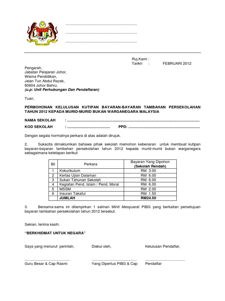 Contoh Format Surat Permohonan Kutipan Bayaran Tambahan 2012 Murid Bukan Warganegara Pdf